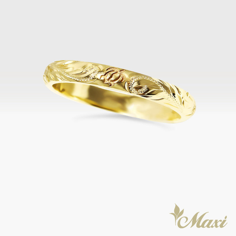 ホヌとはハワイ語でハワイのウミガメ。保護と導きを提供するアウマクア(祖先の霊)の一形態と考えられています。 リングの模様はホヌの周囲にマイレの葉と波を組み合わせたもの。マイレの葉は神聖な絆を象徴し、波は永遠の幸福を象徴します。模様を繊細に手彫りし、ホヌを包み込むように仕上げています。